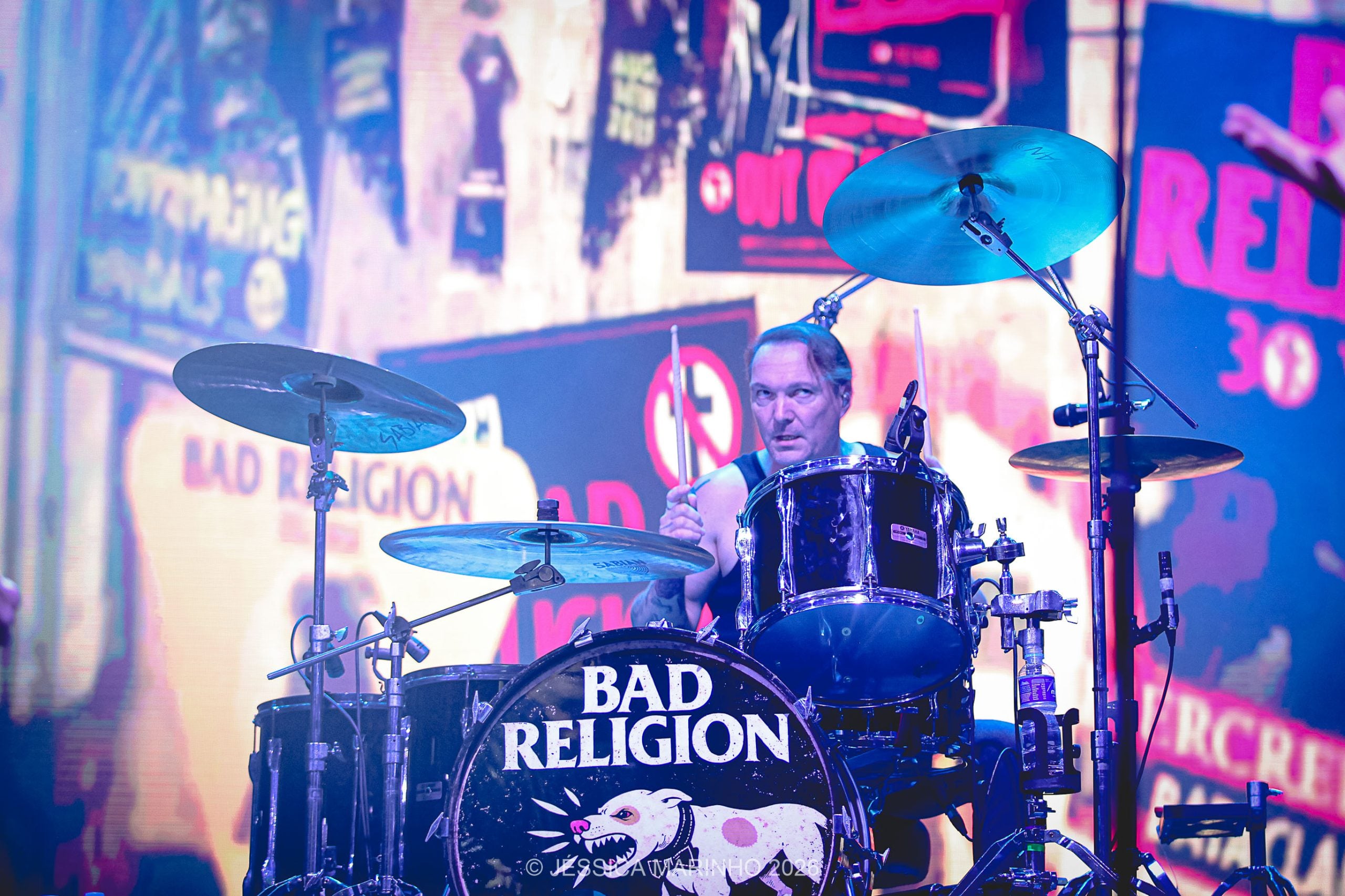 Os primeiros acordes de ‘’Recipe for Hate’’ foram recebidos com pulos, gritos e assovios, enquanto a capa clássica parecia se projetar do telão para morder a alienação da sociedade, assim como a própria música. Apesar da velocidade do setlist, o vocalista tirou um tempo para conversar com os fãs, celebrando o retorno e reconhecendo alguns rostos de outros carnavais. Mesmo com a simplicidade da apresentação, sem a necessidade de recursos cenográficos complexos ou iluminação excessiva, o telão mudava a cada faixa para exibir o logo, o nome da canção ou ilustrações que interagiam com a essência das letras. Greg Graffin, aliás, mostrou-se brincalhão e gestual, soando por vezes até irônico em sua teatralidade contida. Já Jay Bentley, o único outro remanescente da formação original, exibia um ar mais jovial e a posição de ataque característica do gênero enquanto dedilhava seu baixo.